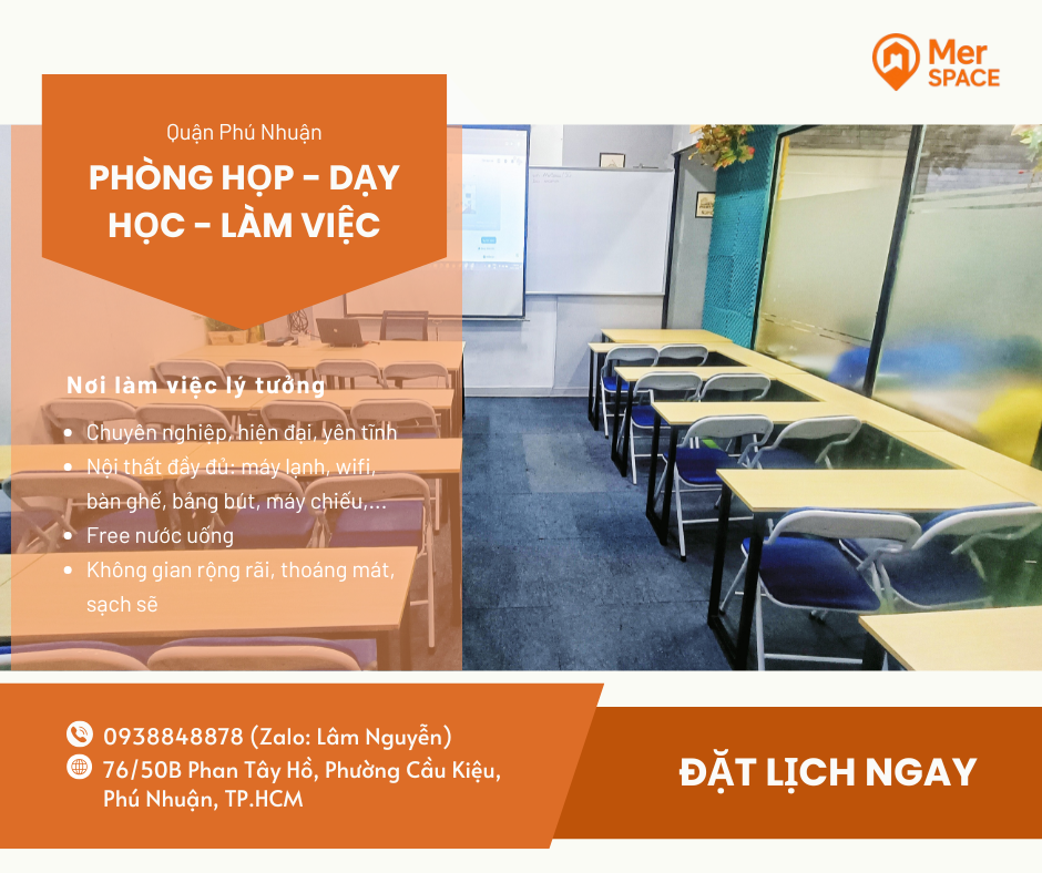 Với hàng loạt lợi ích như linh hoạt thời gian, tối ưu chi phí, không gian đẹp, trang thiết bị hiện đại và đầy đủ dịch vụ hỗ trợ, không khó hiểu vì sao phòng họp, phòng dạy học dành cho 20 - 30 người thuê theo giờ ngày càng được khách hàng lựa chọn. Nếu bạn đang cần một không gian chuyên nghiệp để tổ chức buổi họp, lớp học, workshop hay bất kỳ sự kiện quy mô vừa nào thì Merspace chính là lựa chọn lý tưởng tại Phú Nhuận.